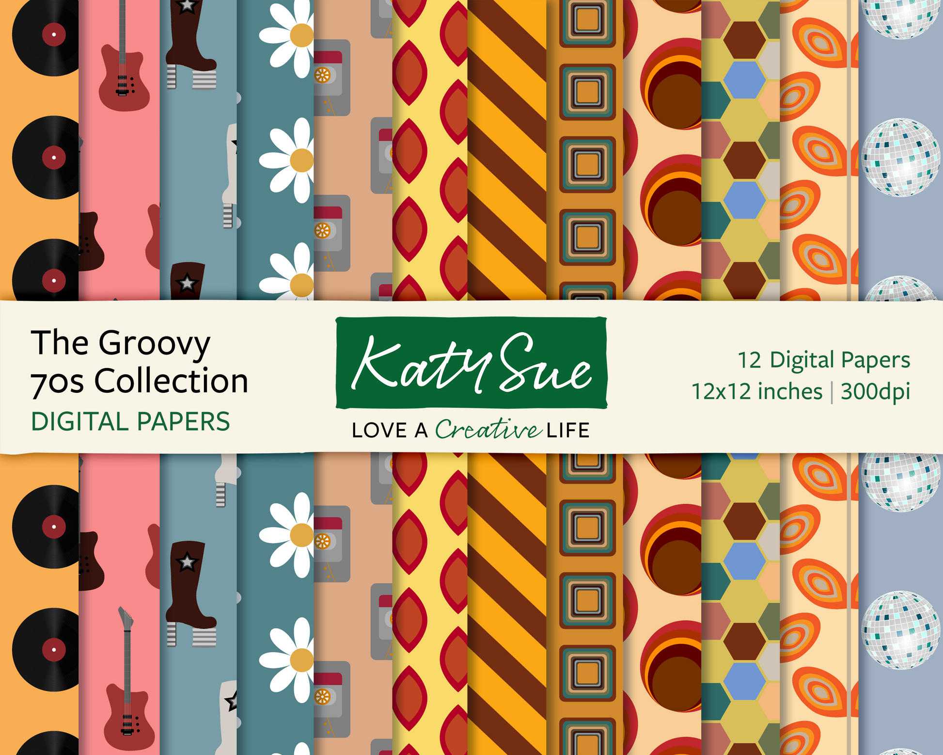 12 retro papers with a variety of 70s motifs. A perfect addition to your digital collection.